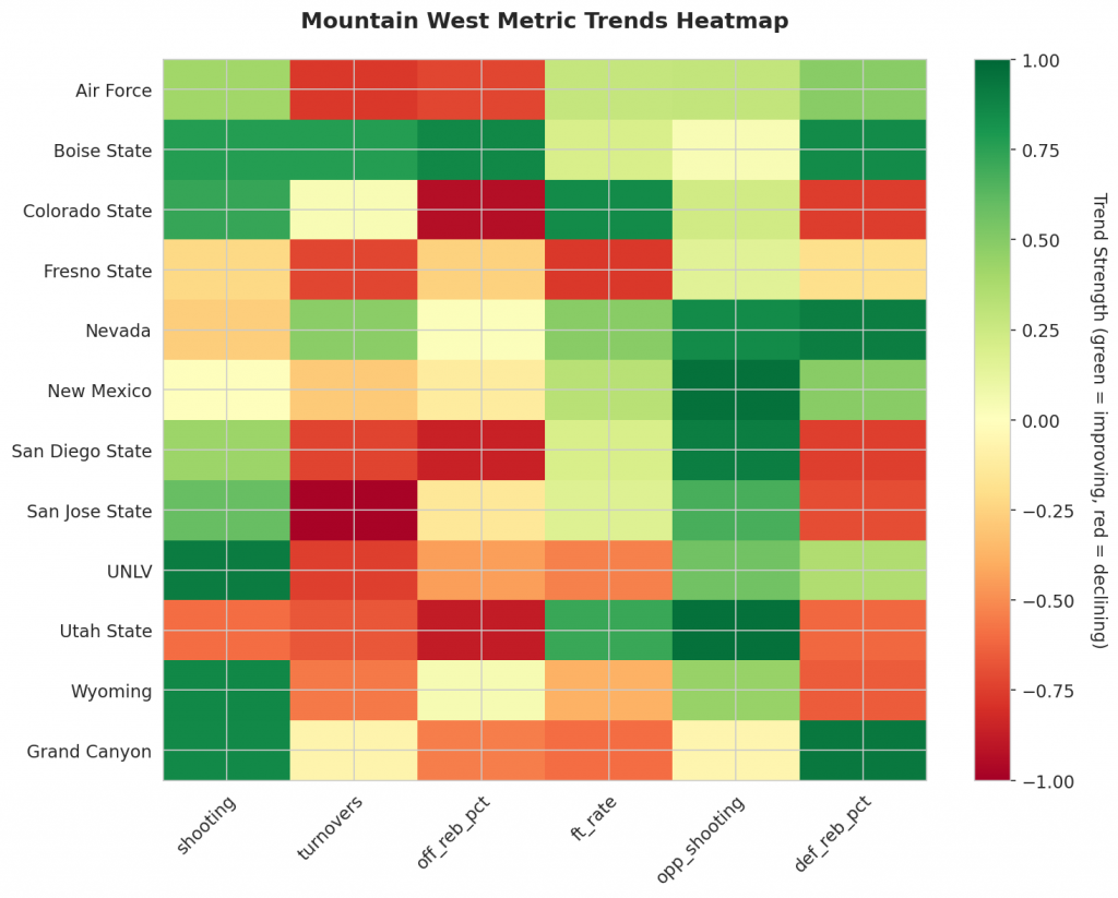 - Trending Up (Efficiency): Air Force, Boise State, Colorado State, New Mexico, San Diego State