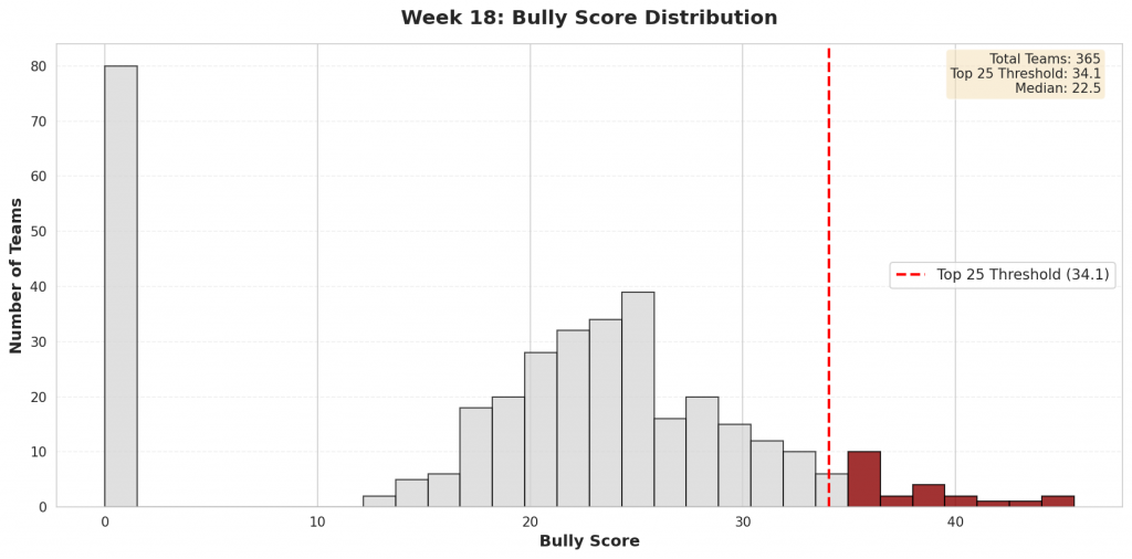 Figure 4: Distribution of bully scores across all Division I teams. The top 25 bullies (highlighted in red) represent teams whose efficiency metrics are most inflated by their performance patterns.