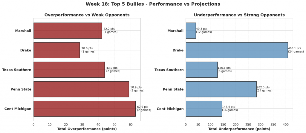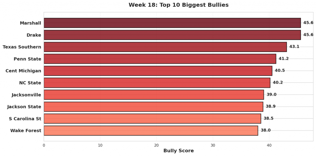 Figure 1: Top 10 teams with the highest bully scores in Week 18. Bully scores reflect the combination of overperformance against weak opponents and underperformance against quality competition.