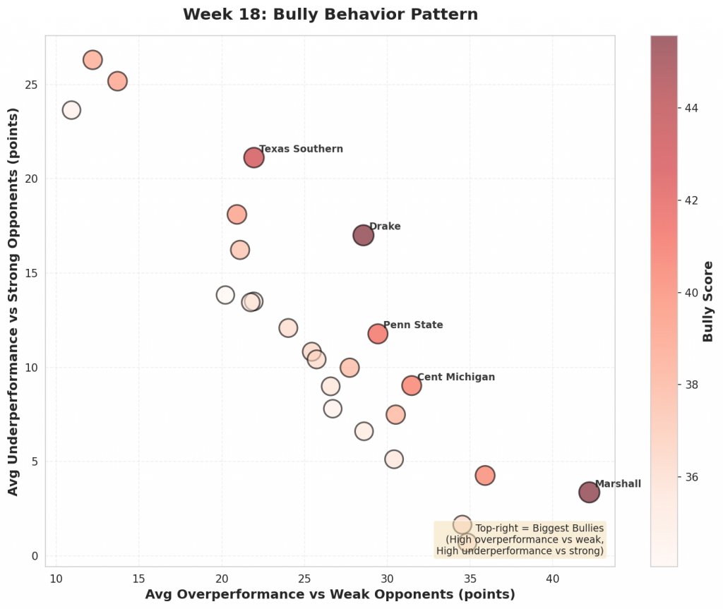 Figure 3: Scatter plot showing the relationship between overperformance against weak opponents (x-axis) and underperformance against strong opponents (y-axis). Bubble size and color indicate bully score magnitude. Top-right quadrant represents the biggest bullies.